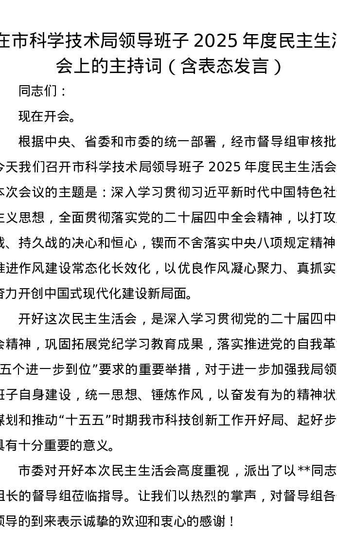 在市科学技术局领导班子2025年度xxxxx上的主持词(含表态发言)