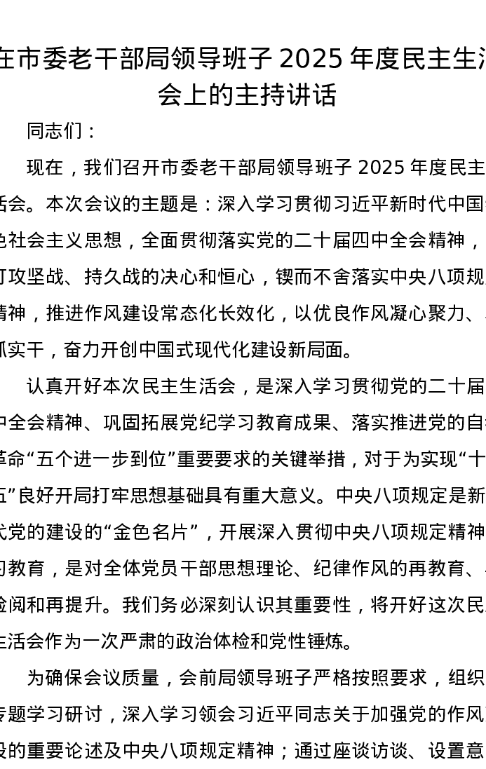 在市委老干部局领导班子2025年度xxxxx上的主持讲话