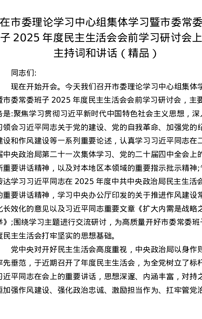 在市委理论学习中心组集体学习暨市委常委班子2025年度xxxxx会前学习研讨会上的主持词和讲话