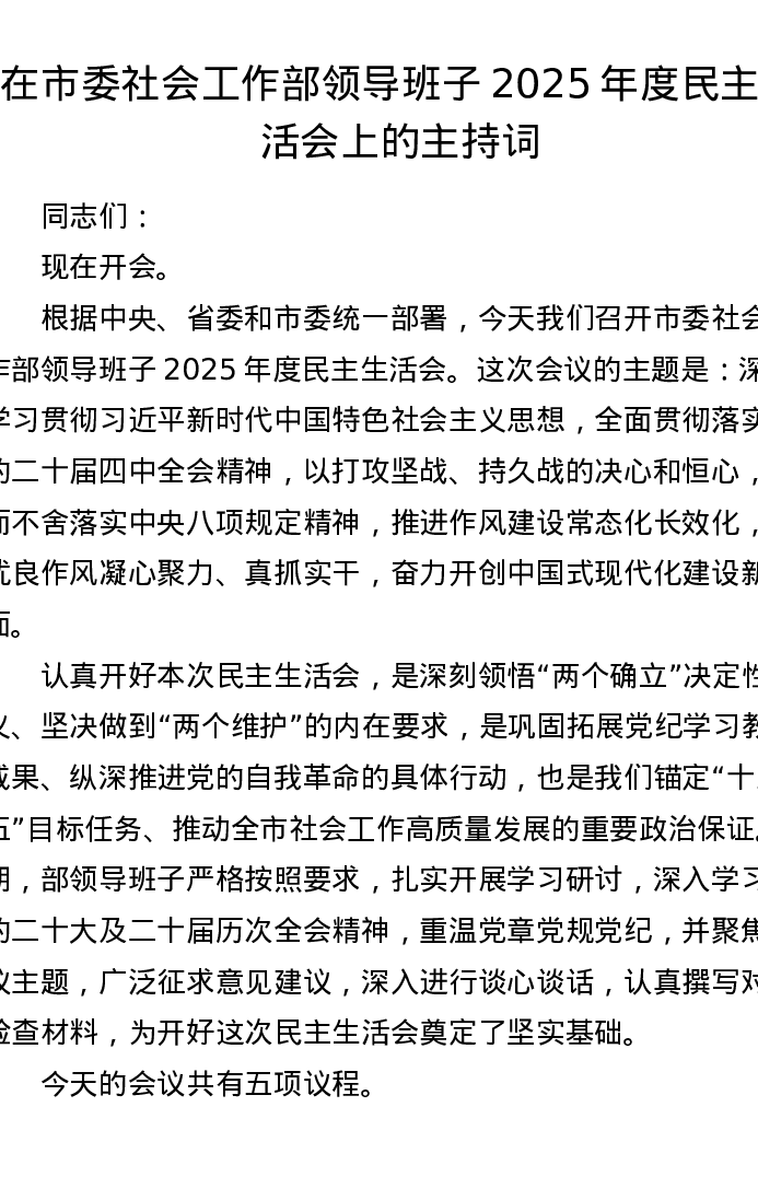 在市委社会工作部领导班子2025年度xxxxx上的主持词