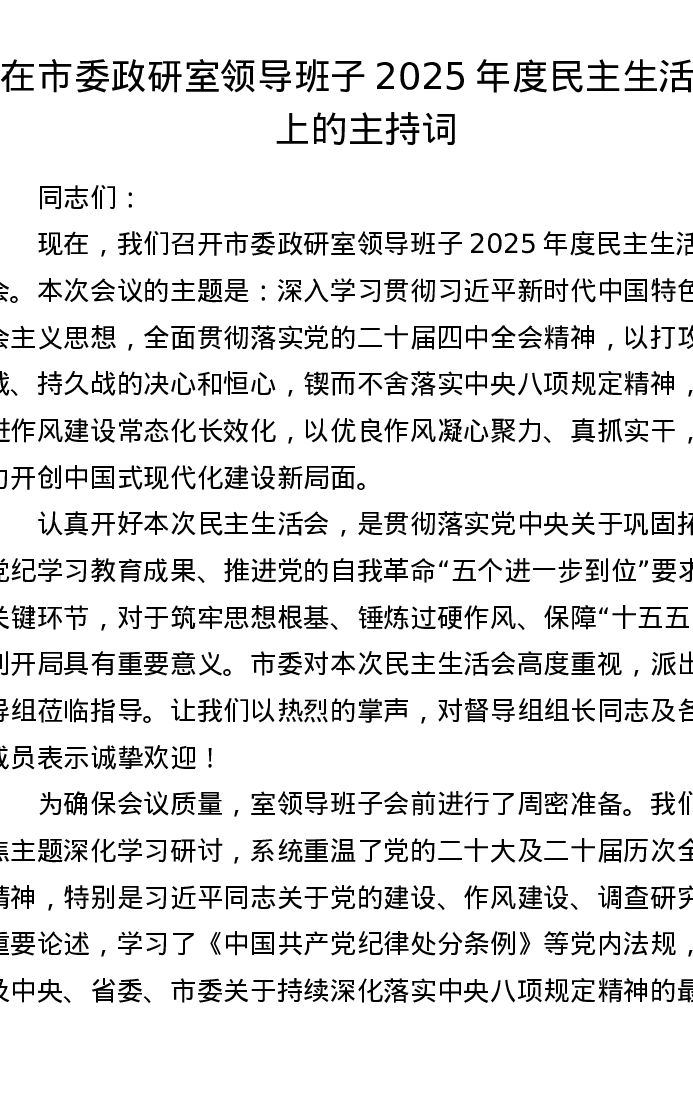在市委政研室领导班子2025年度xxxxx上的主持词