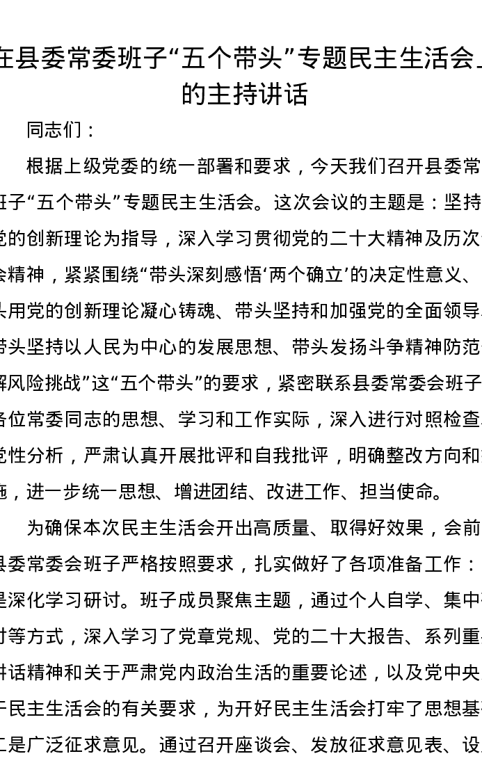 在县委常委班子五个带头专题xxxxx上的主持讲话