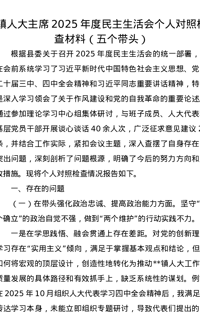 镇人大主席2025年度xxxxx个人对照检查材料(五个带头)
