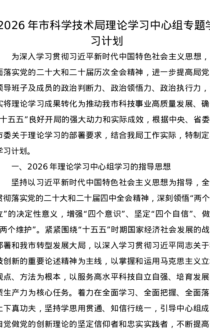 2026年市科学技术局理论学习中心组专题学习计划