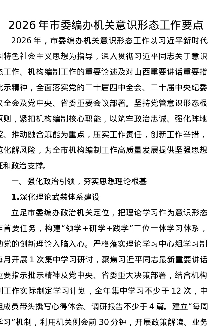 2026年市委编办机关意识形态工作要点
