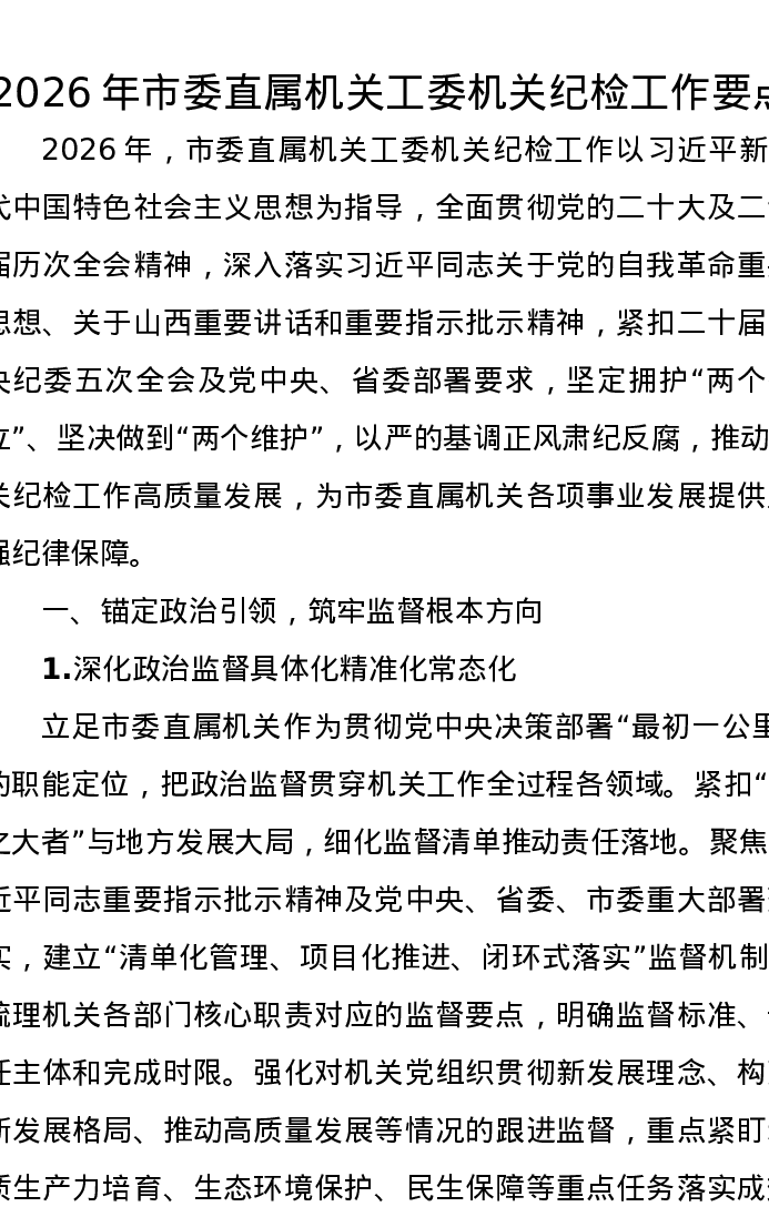 2026年市委直属机关工委机关纪检工作要点