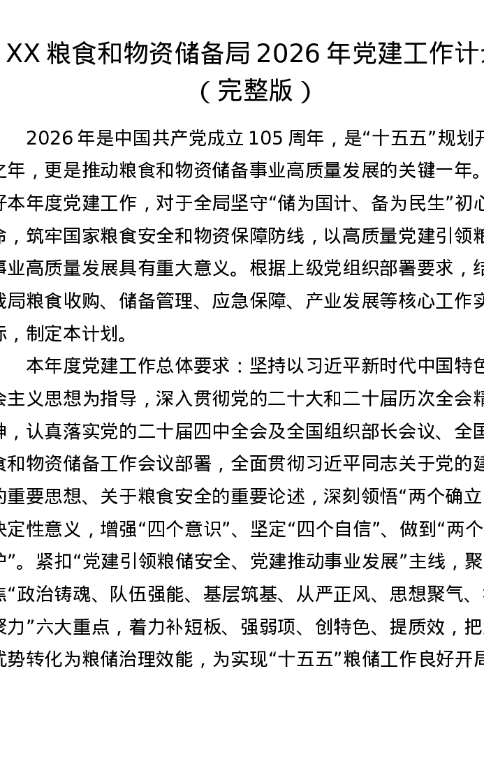 XX粮食和物资储备局2026年党建工作计划(完整版)