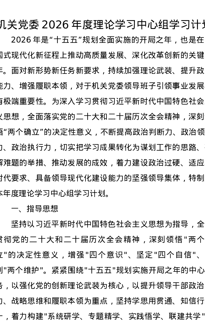 机关党委2026年度理论学习中心组学习计划