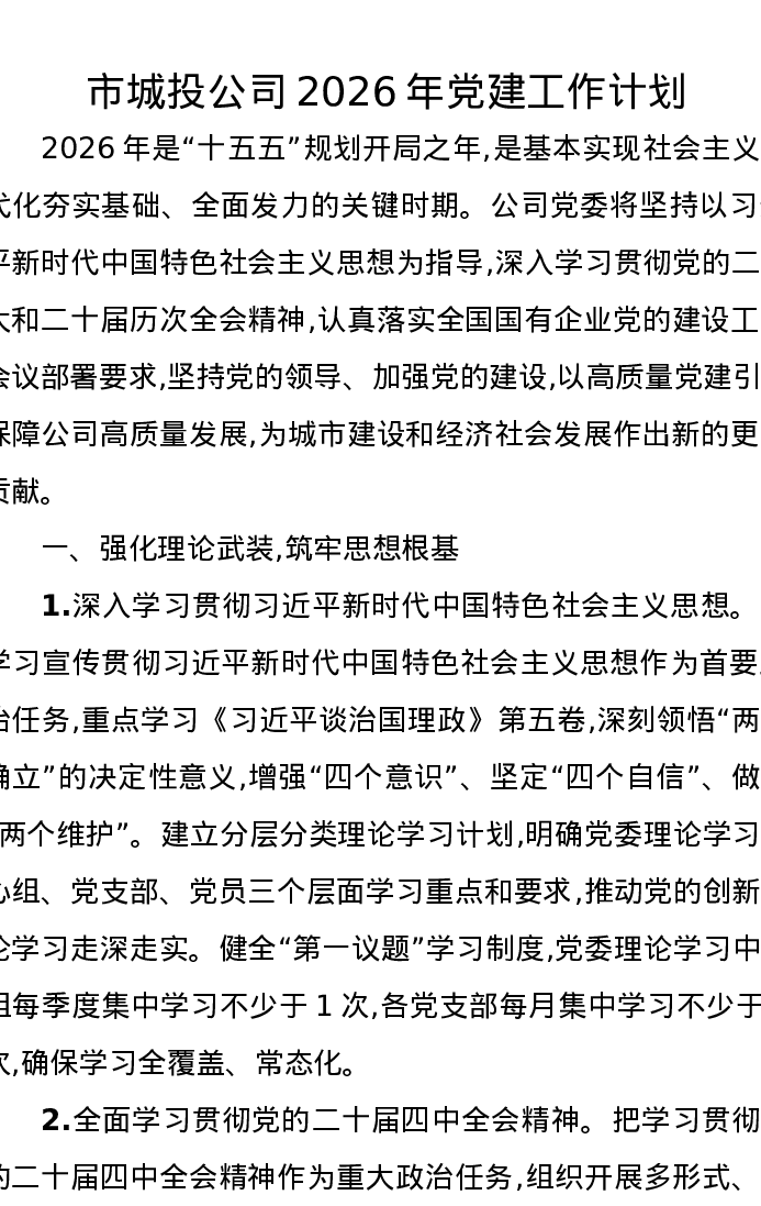 市城投公司2026年党建工作计划