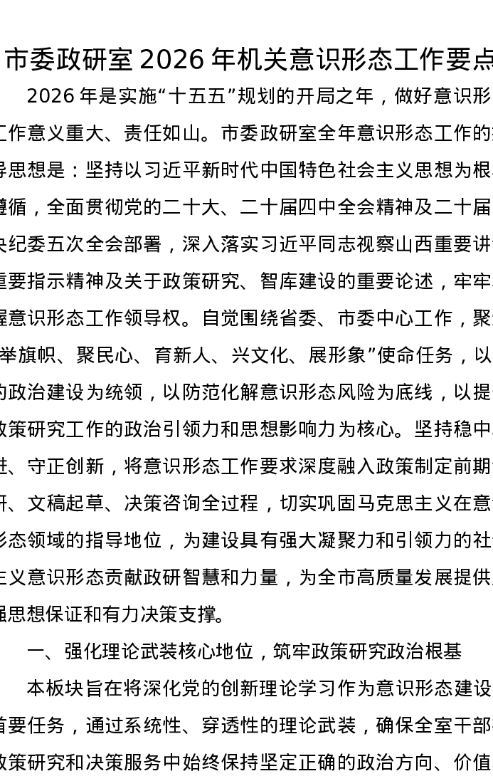 市委政研室2026年机关意识形态工作要点