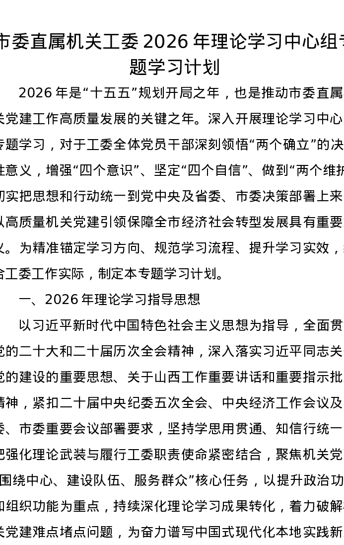 市委直属机关工委2026年理论学习中心组专题学习计划