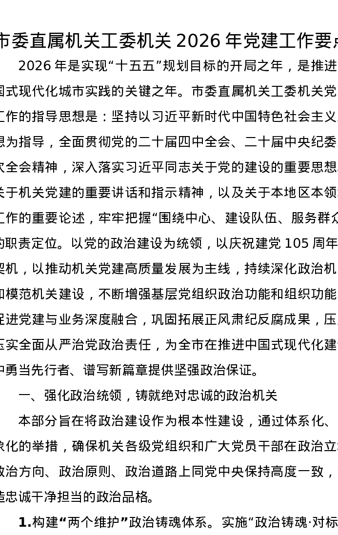 市委直属机关工委机关2026年党建工作要点