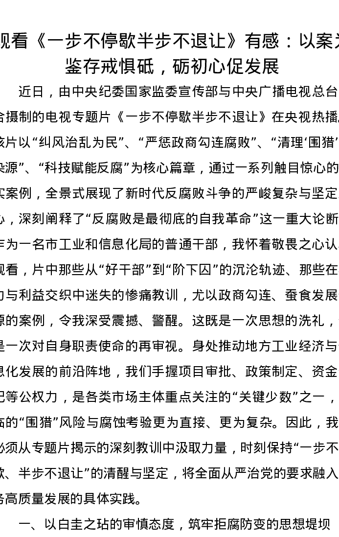 观看《一步不停歇半步不退让》有感:以案为鉴存戒惧砥,砺初心促发展