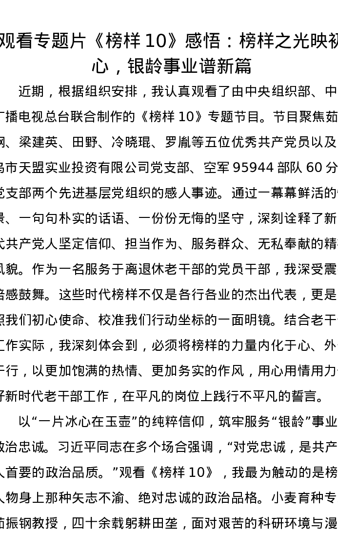 观看专题片《榜样10》感悟:榜样之光映初心,银龄事业谱新篇
