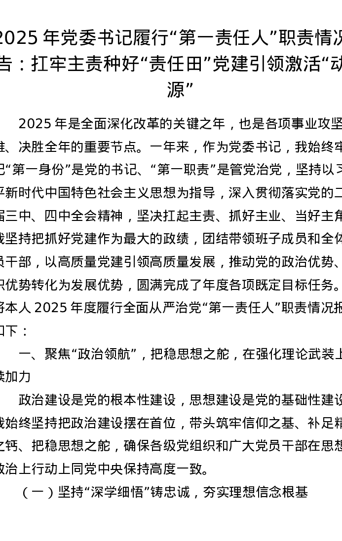2025年党委书记履行第一责任人职责情况报告:扛牢主责种好责任田 党建引领激活动力源
