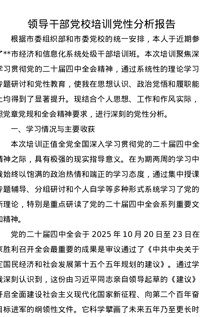 领导干部党校培训党性分析报告