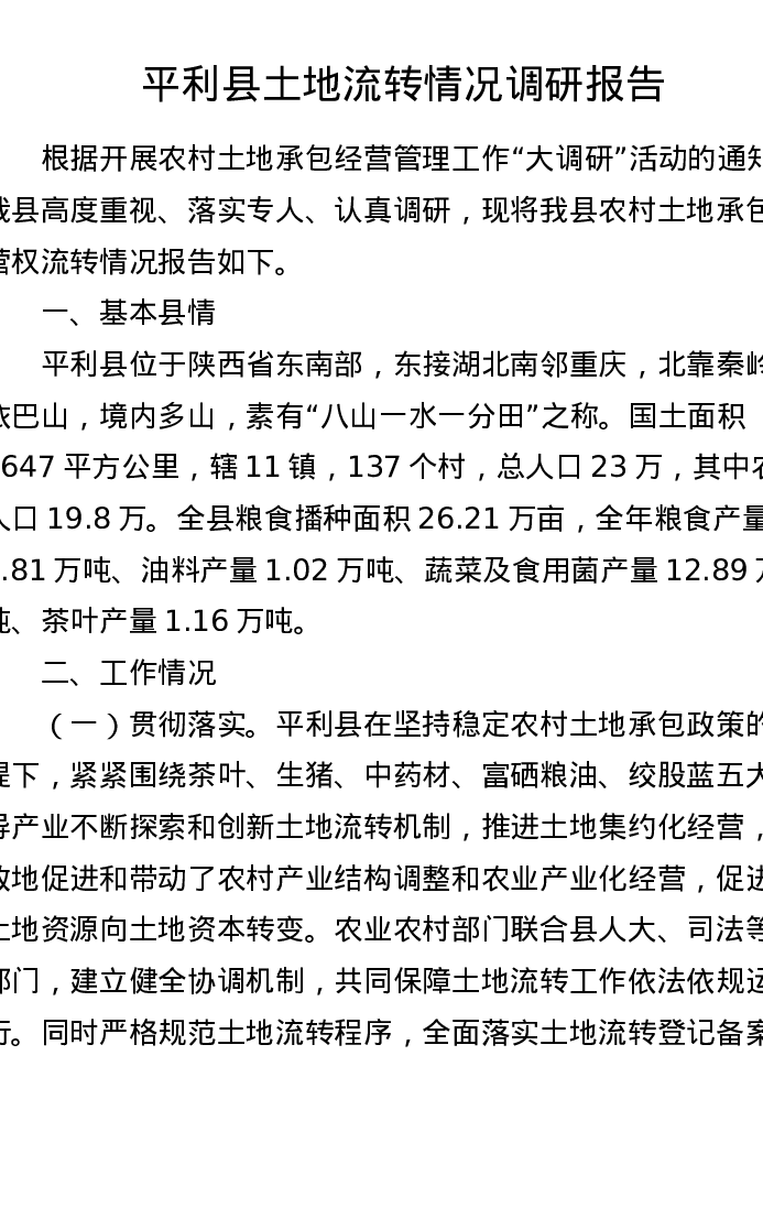 平利县土地流转情况调研报告