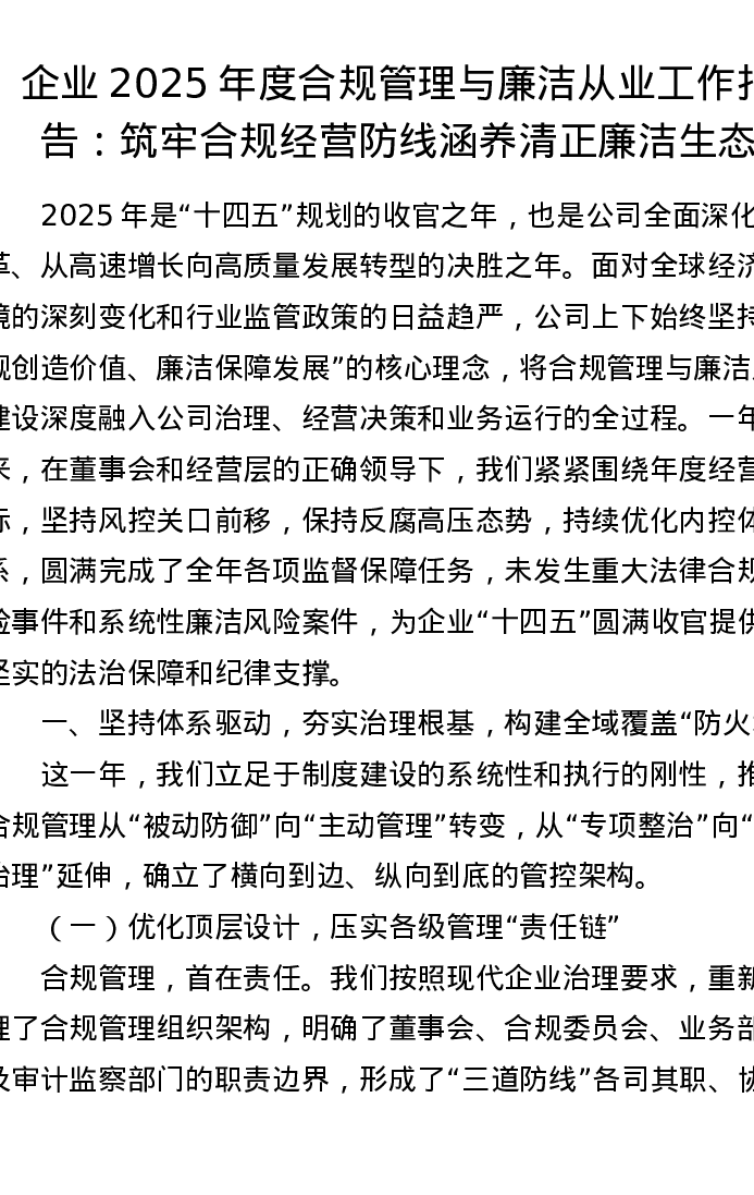 企业2025年度合规管理与廉洁从业工作报告:筑牢合规经营防线 涵养清正廉洁生态