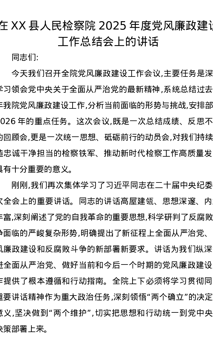在XX县人民检察院2025年度党风廉政建设工作总结会上的讲话2