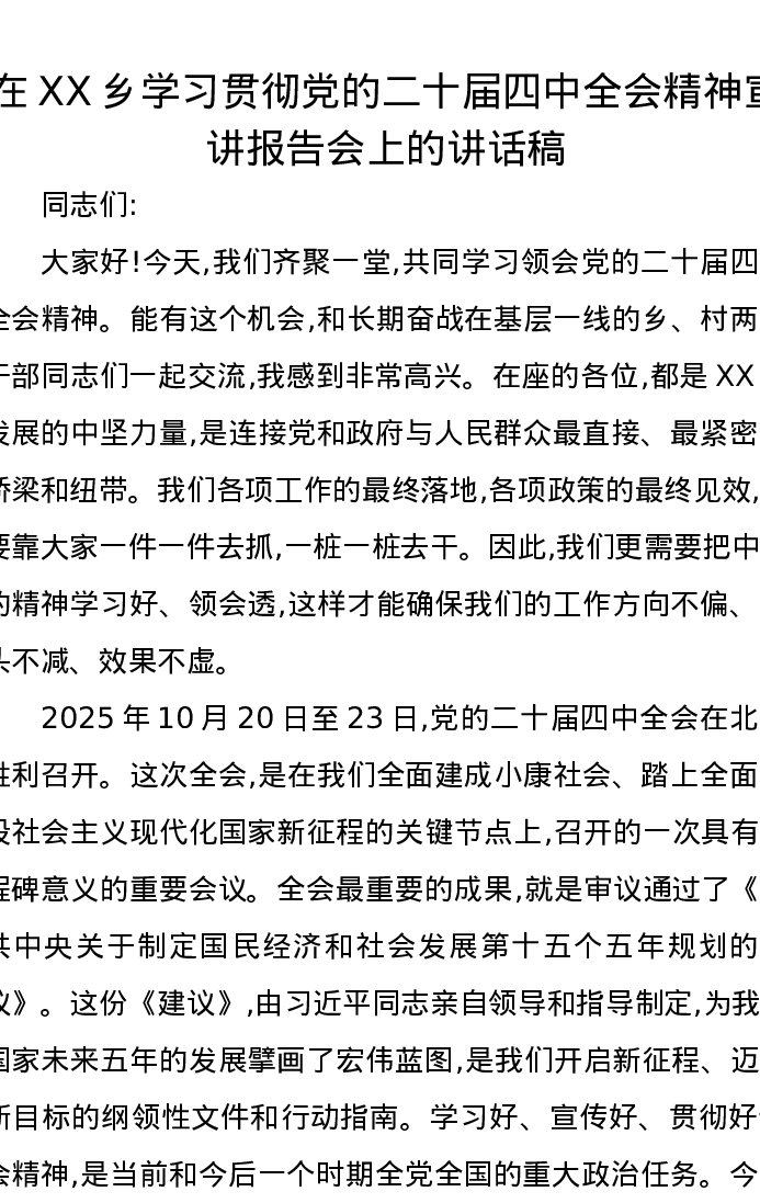在XX乡学习贯彻党的二十届四中全会精神宣讲报告会上的讲话稿