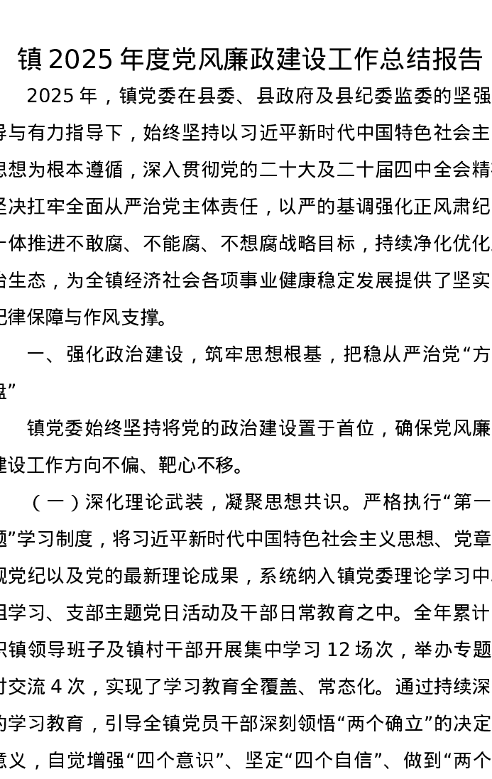 镇2025年度党风廉政建设工作总结报告