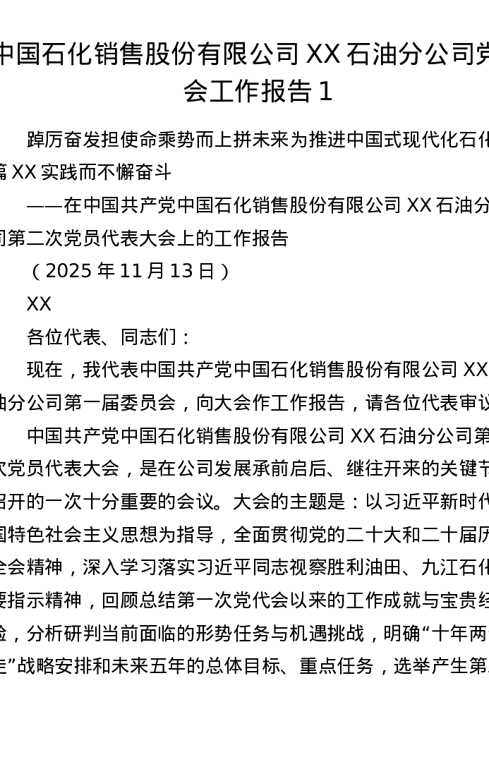 中国石化销售股份有限公司XX石油分公司党代会工作报告1