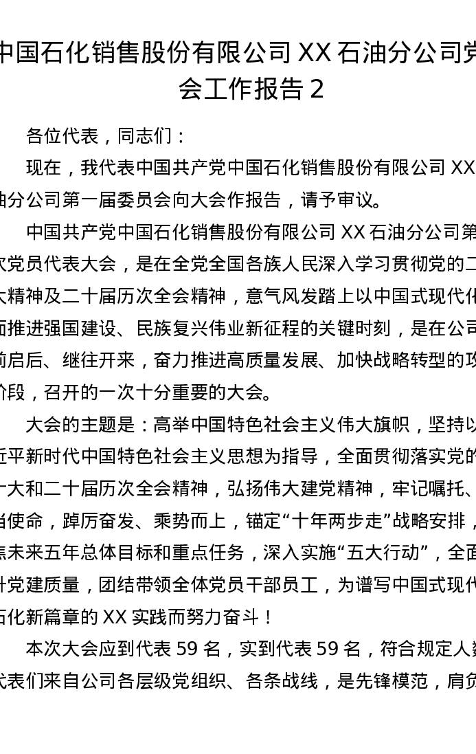 中国石化销售股份有限公司XX石油分公司党代会工作报告2