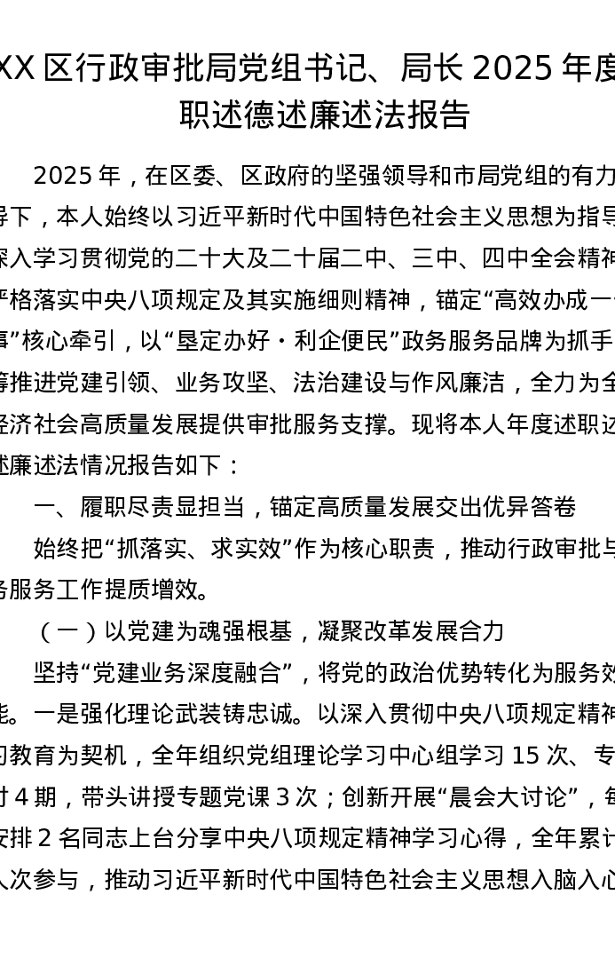 XX区行政审批局党组书记、局长2025年度述职述德述廉述法报告