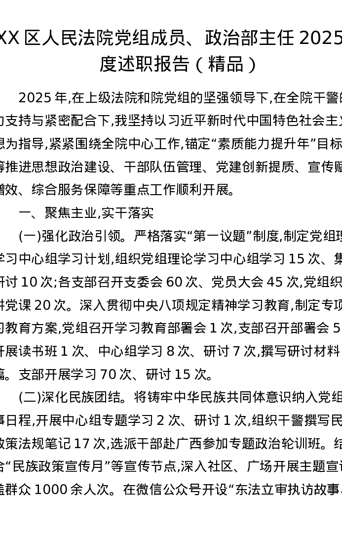 XX区人民法院党组成员、政治部主任2025年度述职报告
