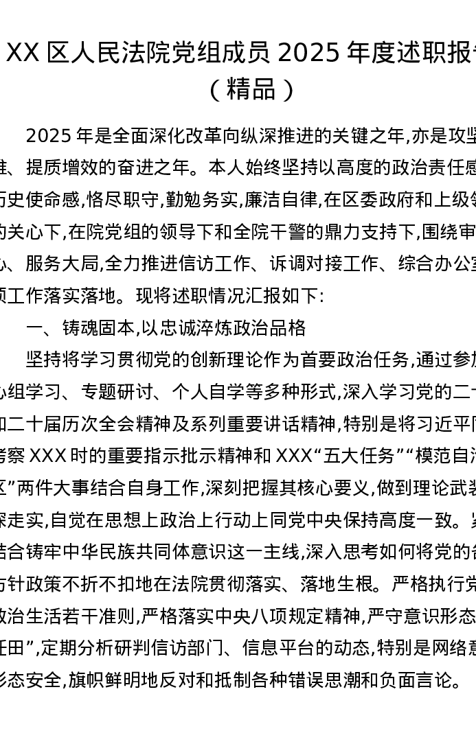 XX区人民法院党组成员2025年度述职报告