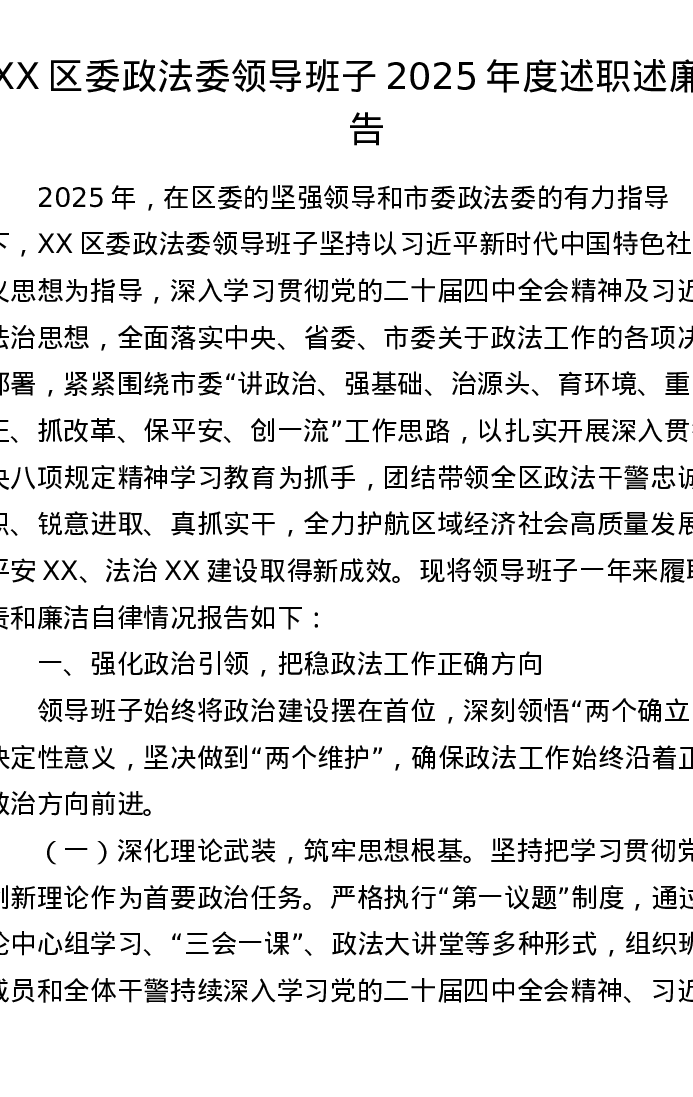 XX区委政法委领导班子2025年度述职述廉报告