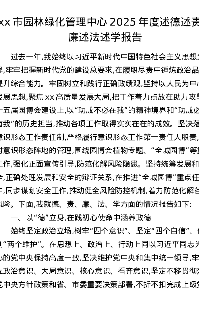 xx市园林绿化管理中心2025年度述德述责述廉述法述学报告