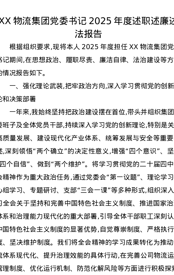 XX物流集团党委书记2025年度述职述廉述法报告