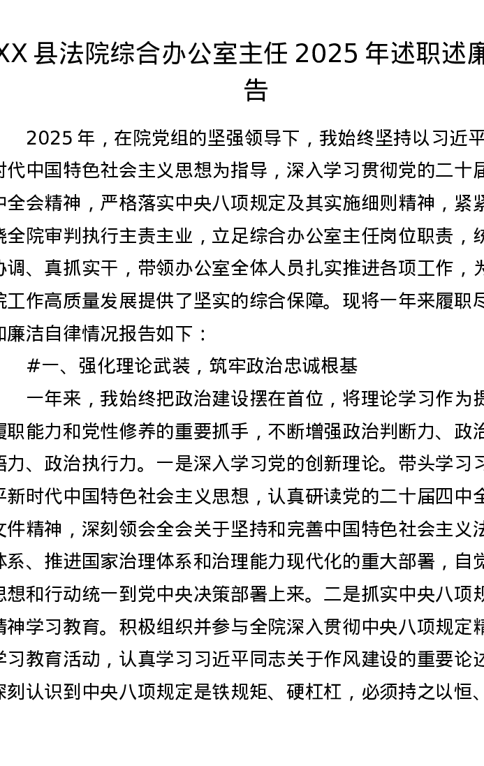 XX县法院综合办公室主任2025年述职述廉报告(3579字)
