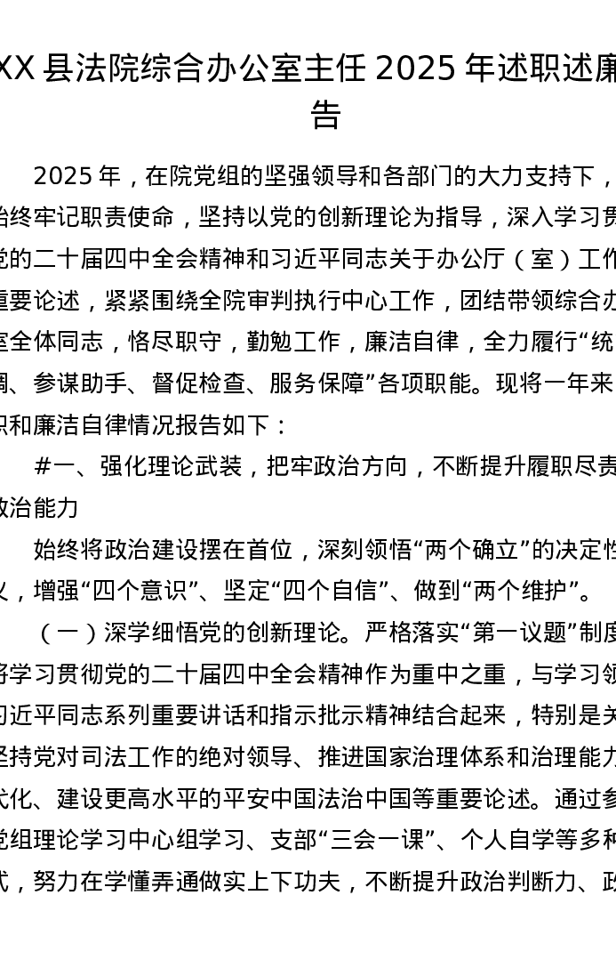 XX县法院综合办公室主任2025年述职述廉报告(3620字)