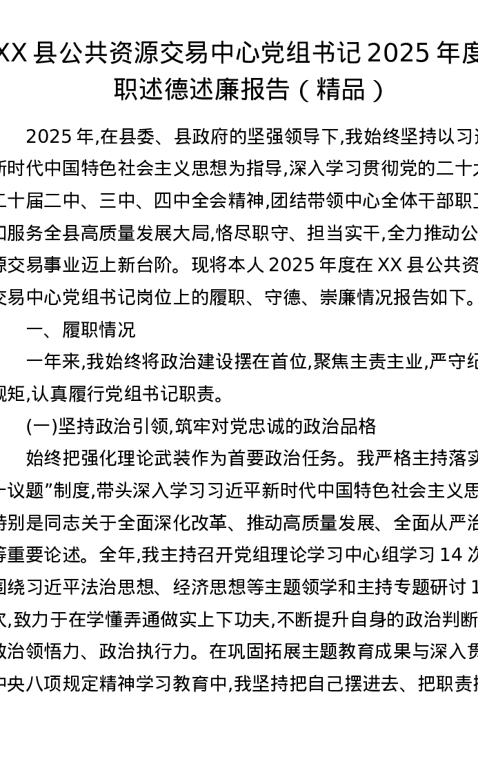 XX县公共资源交易中心党组书记2025年度述职述德述廉报告
