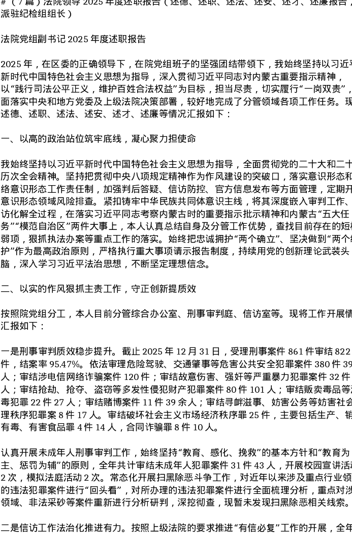 汇编:法院领导2025年度述职报告(述德、述职、述法、述安、述才、述廉报告,含派驻纪检组组长)7篇