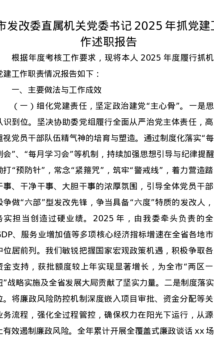 市发改委直属机关党委书记 2025年抓党建工作述职报告