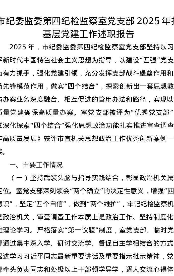 市纪委监委第四纪检监察室党支部2025年抓基层党建工作述职报告