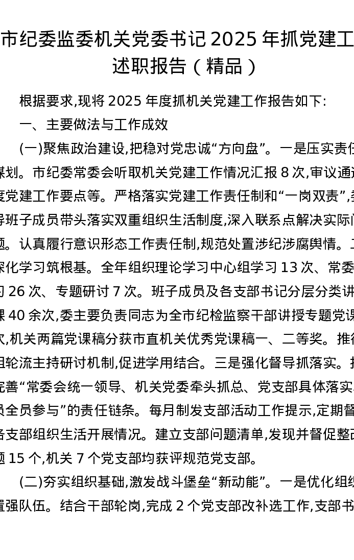市纪委监委机关党委书记2025年抓党建工作述职报告