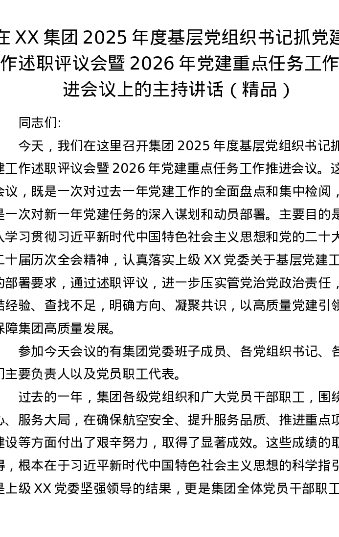 在XX集团2025年度基层党组织书记抓党建工作述职评议会暨2026年党建重点任务工作推进会议上的主持讲话