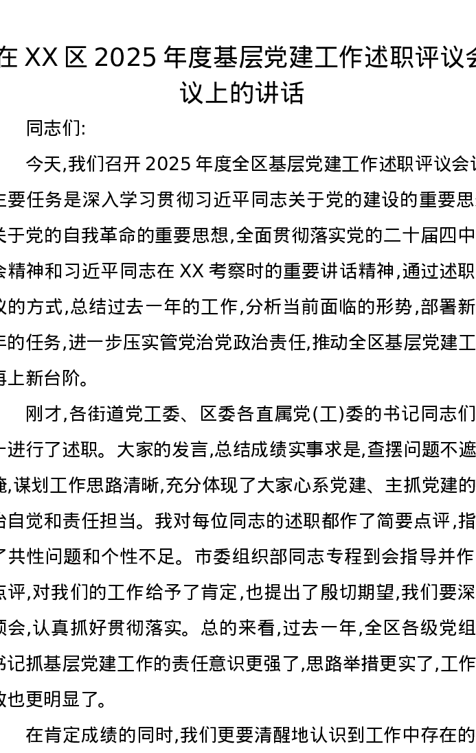 在XX区2025年度基层党建工作述职评议会议上的讲话