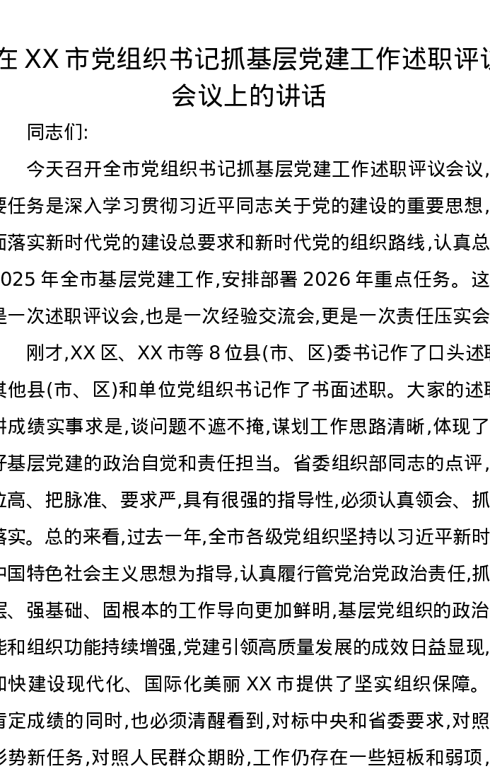 在XX市党组织书记抓基层党建工作述职评议会议上的讲话