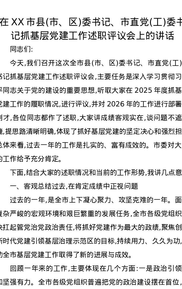在XX市县(市、区)委书记、市直党(工)委书记抓基层党建工作述职评议会上的讲话