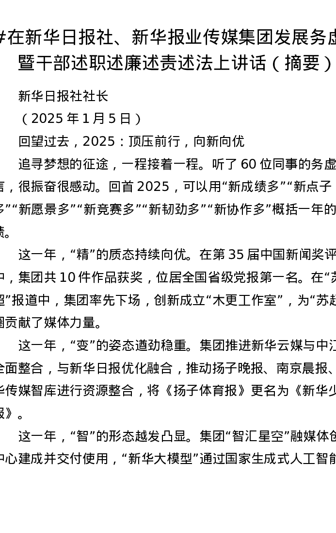 在新华日报社、新华报业传媒集团发展务虚会暨干部述职述廉述责述法上讲话(摘要)