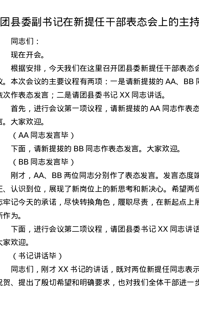 团县委副书记在新提任干部表态会上的主持词(523字)