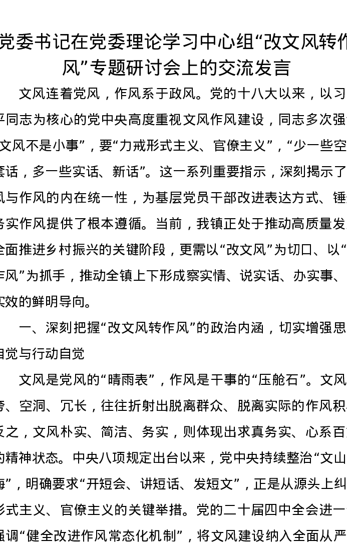 党委书记在党委理论学习中心组改文风转作风专题研讨会上的交流发言