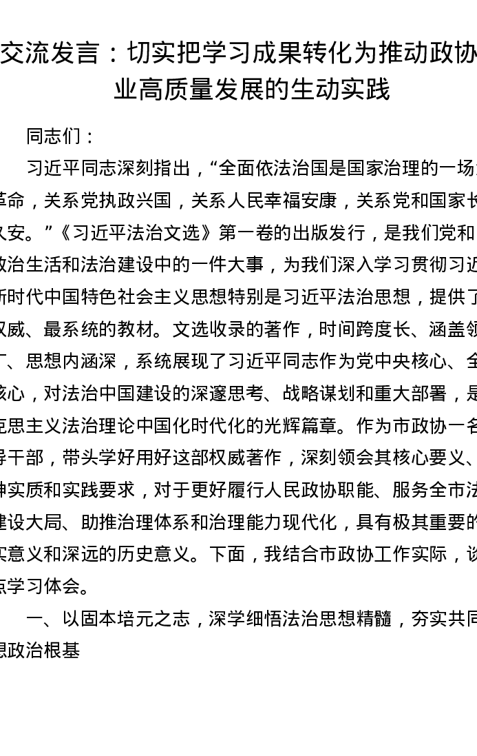交流发言:切实把学习成果转化为推动政协事业高质量发展的生动实践