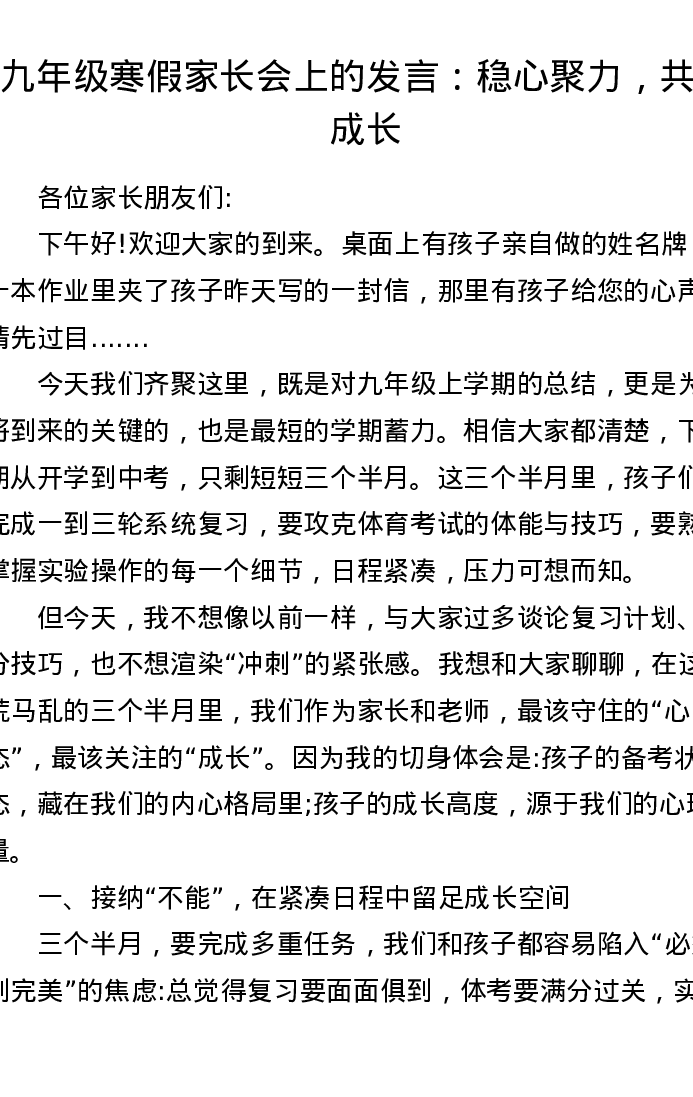 九年级寒假家长会上的发言:稳心聚力,共赴成长