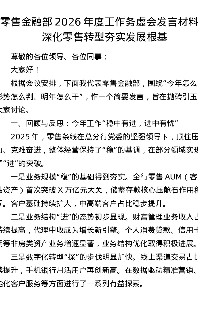 零售金融部2026年度工作务虚会发言材料:深化零售转型 夯实发展根基